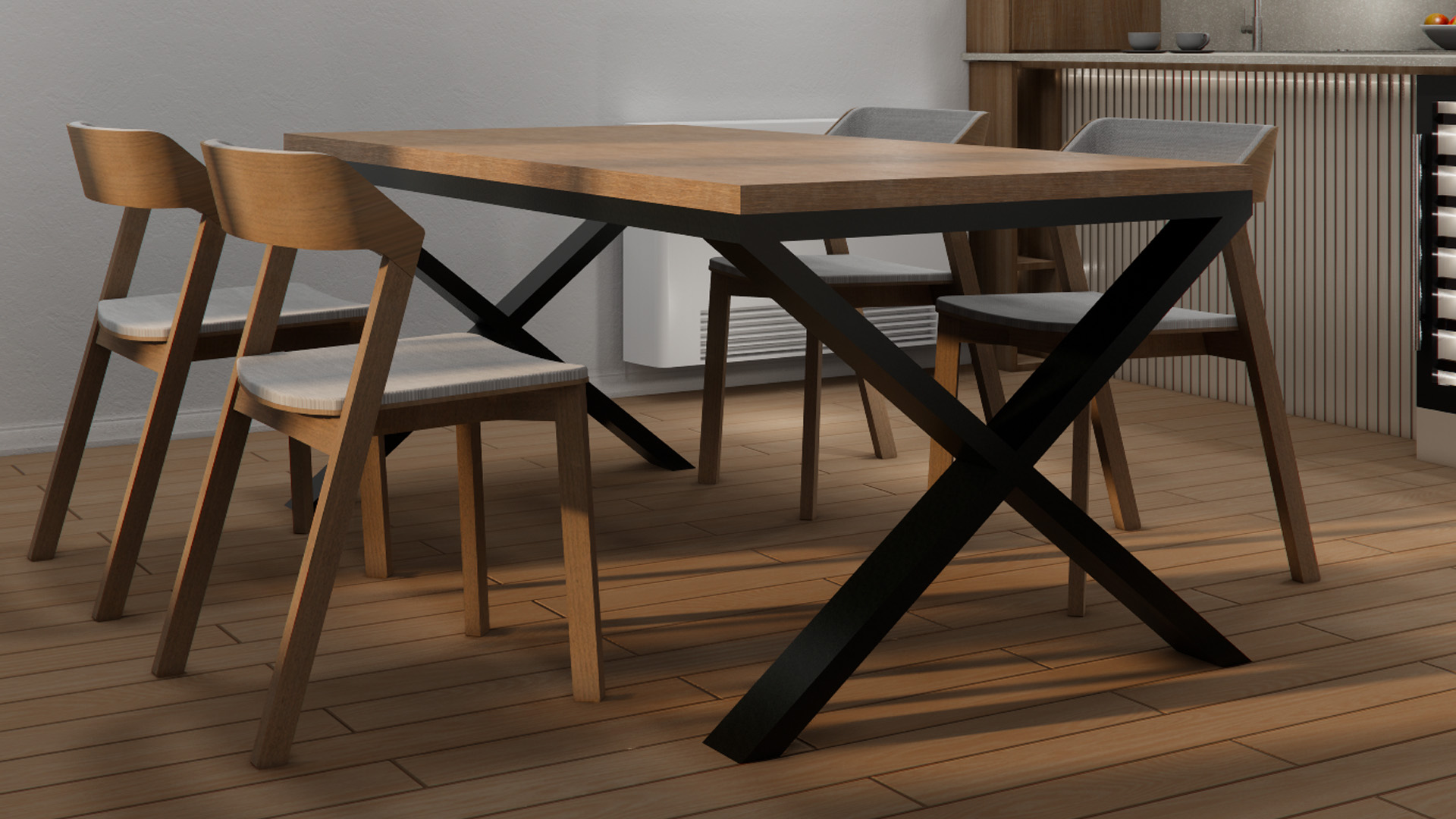 Ovaj trpezarijski sto odlikuje se modernim dizajnom sa masivnom pločom pravougaonog oblika, koja unosi prirodnu toplinu u prostor. Njegova crna metalna konstrukcija sa ukrštenim nogarima u obliku slova ‘X’ pruža stabilnost i vizuelno atraktivan, industrijski stil koji se savršeno uklapa u moderne enterijere.